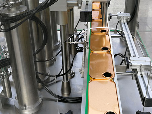 全套定量灌裝機械開機操作,在啟動開機時,首要動空壓機,打開灌裝機氣閥向灌裝機供氣,送上電源,開啟成品罐底部放料閥, 向全套定量灌裝機械供料,觀察中控屏顯示料位到達后,進料閥應自動關閉,若不自動關閉則應立即放料閥檢查,問題排除后方可繼續操作,料位正常后,按照產品容量調整灌裝機計量,先用單次灌裝,調好計量后按“啟動”按鈕2秒以上,機械可自動開始運行灌裝,全套定量灌裝機械根據生產線其它設備速度,用"快慢"調速旋鈕,調整速度。我們在操作時需要注意的首先要根據瓶子高度調整感應頭高度,根據瓶子寬度調整傳送帶護欄寬度,按下"ON"按鈕,電源指示燈、“COOL ER”亮,警燈閃爍,水泵、風扇開始工作,檢查水箱回水口有水流出,然后按下“START"按鈕,警示燈熄滅,START燈點亮,功率顯示在20- 50之間的數值,可以開始旋蓋作業。